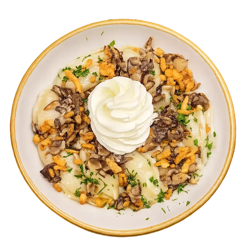 Mashed potato & onion, mushroom sauce, fried mushrooms, crispy onion.